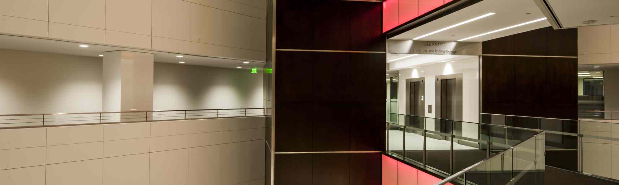 Upgrades included a reoriented main entrance with a sculptural canopy, redesigned multi-story lobby with LED accent lighting, and modernized common areas with sustainable, high-efficiency systems. The refreshed mezzanine and office floors now feature modern materials, updated finishes, and improved wayfinding, while exterior enhancements and terrace upgrades provide inviting outdoor spaces for informal gatherings.