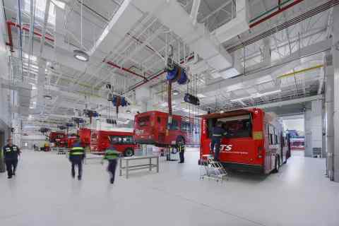 With expanded capacity and streamlined functionality, the facility increased its bus service capabilities from 174 to 240 buses, significantly enhancing regional transit operations. The project achieved LEED® Silver Certification, incorporating natural daylighting, photovoltaic power generation, and a high-performance building envelope while meeting local environmental and water discharge standards.
